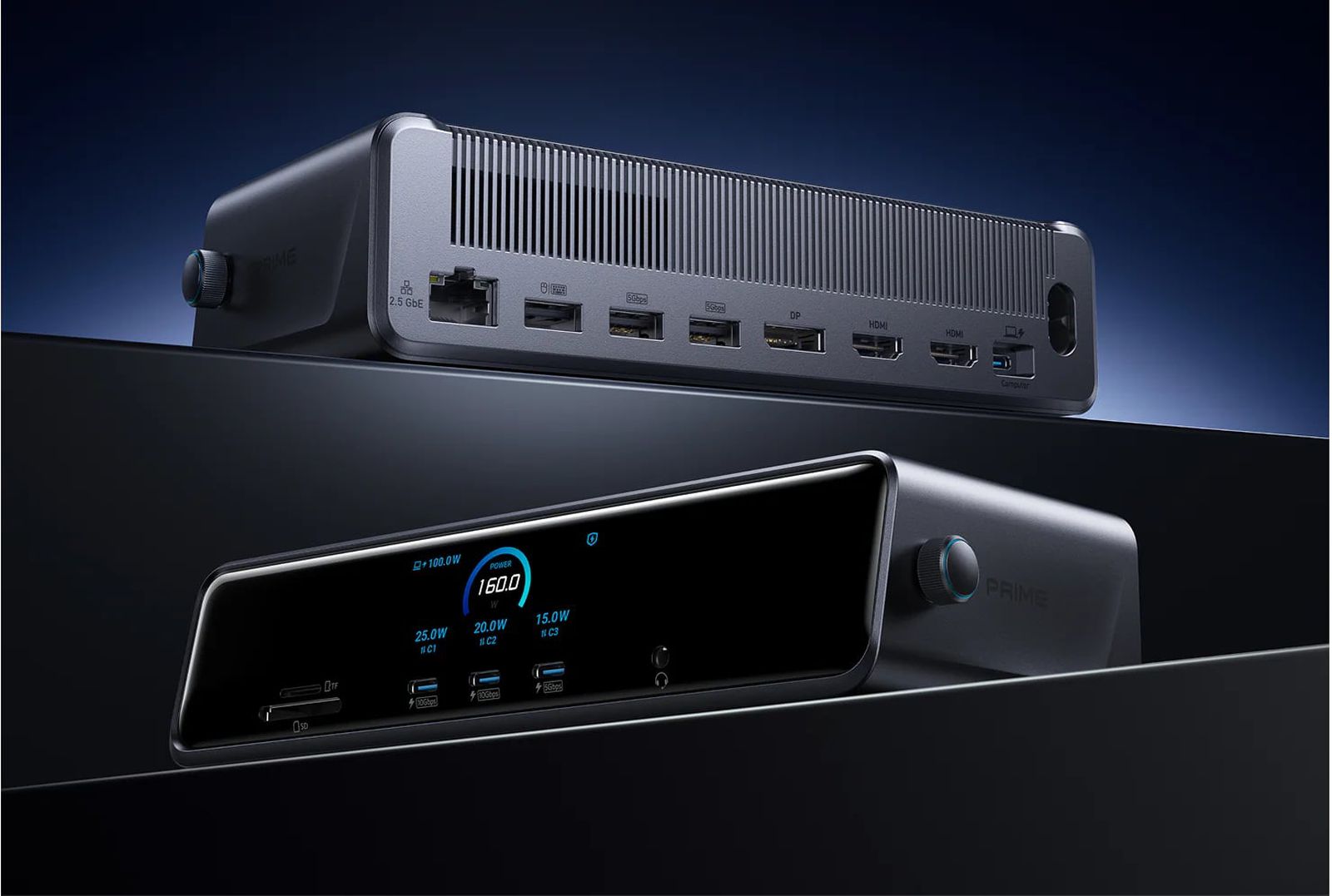 Accanto a lei troviamo la Prime Docking Station 14-in-1, la soluzione definitiva per chi vuole trasformare il proprio laptop in una vera e propria postazione desktop multifunzione. Immaginala come il centro pulsante della scrivania: può gestire fino a tre monitor in simultanea (supportando risoluzioni fino a 8K + 4K + 4K), grazie alla presenza di porte HDMI, DisplayPort e interfacce USB‑C ad alta velocità. Il suo smart display integrato non serve solo per caricare: mostra in tempo reale assorbimento energetico, stato delle connessioni, segnale video e persino la temperatura, per tenere sempre tutto sotto controllo