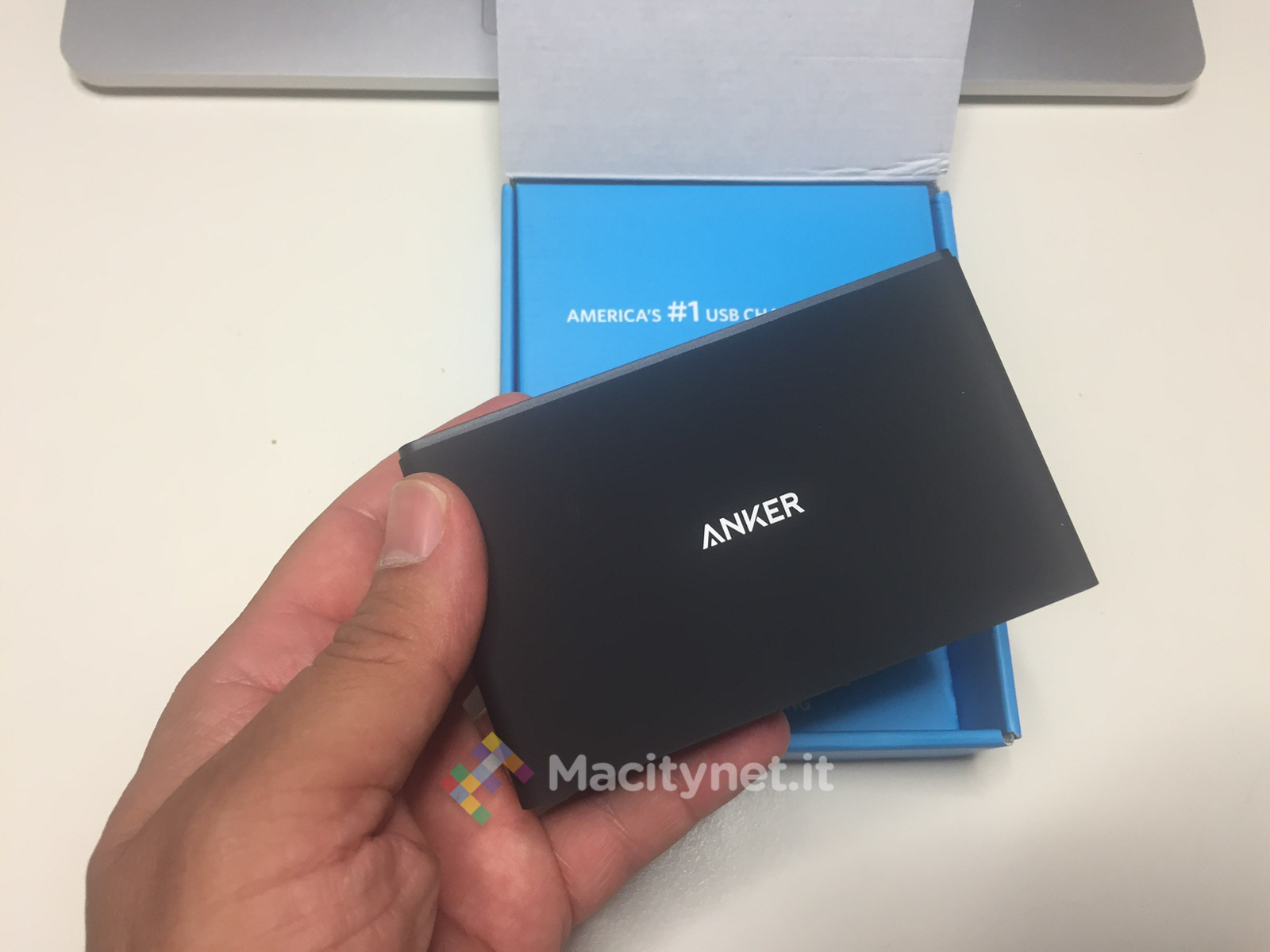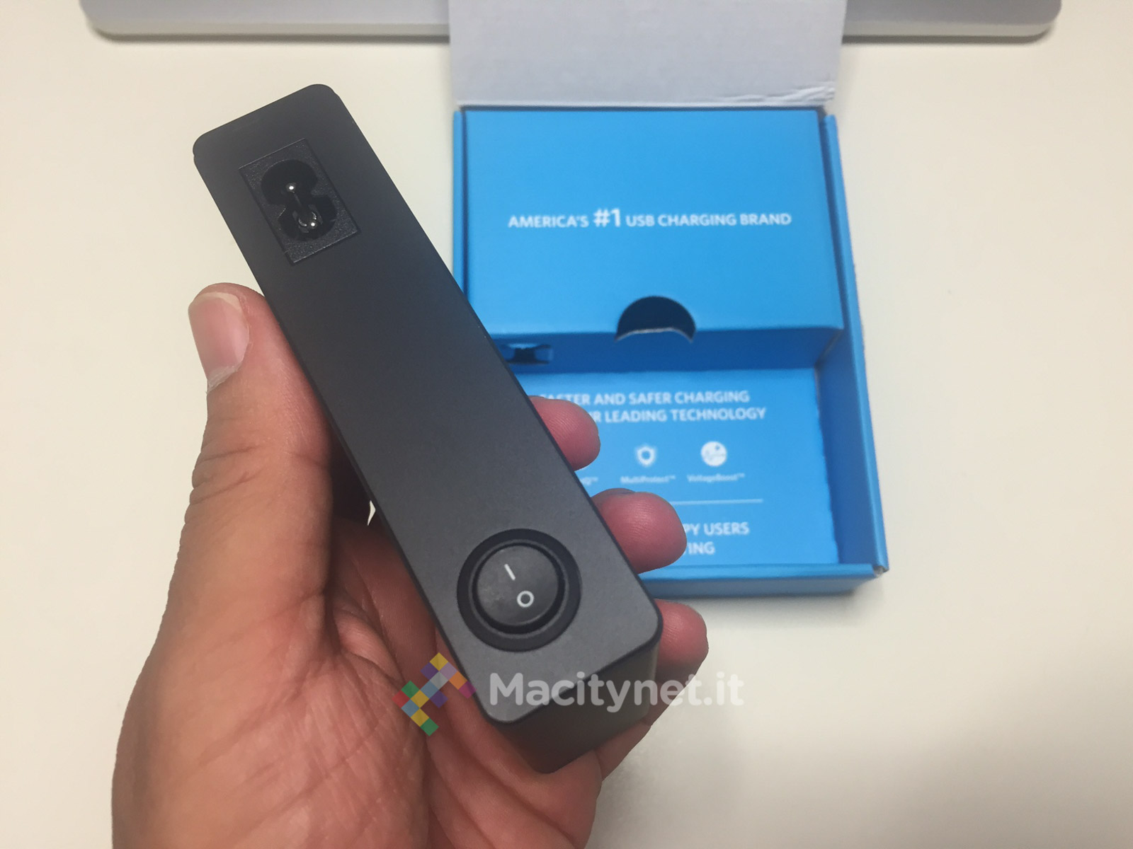 Nonostante non sia grande e pensante al punto da renderlo improponibile come accessorio da valigia, Anker l’ha studiato come accessorio da scrivania. Per questo se vorremo tenerlo fisso su una qualsiasi superficie ci si può affidare all’adesivo incluso nella confezione che lo mantiene ben saldo facilitando così l’inserimento e l’estrazione dei vari cavi di ricarica. Nella scatola ci sono anche due anelli in velcro che permettono mantenere in ordine il cavo.