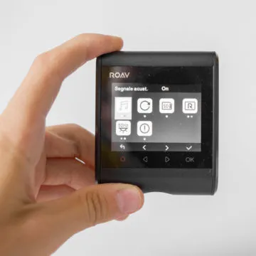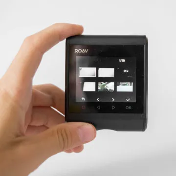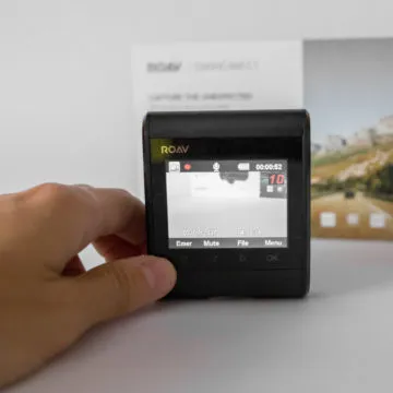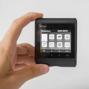 Roav C1 non è tra le più piccole camere di questo tipo in commercio per il semplice motivo che ospita, sul retro, uno schermo LCD da 2.4‘’ (4.3 x 3.5 centimetri) con tasti capacitivi utile non solo per verificare in tempo reale il corretto orientamento della videocamera (si può inclinare manualmente per aggiustare l’inquadratura) ma anche per personalizzare le varie impostazioni oppure rivedere rapidamente le registrazioni.