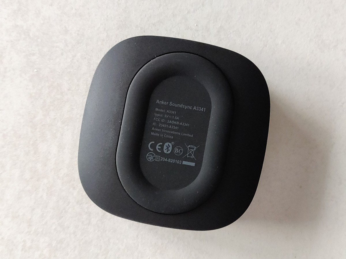 Anker Soundsync A3341 è molto compatto: misura nello specifico 7 x 7 x 2 centimetri, praticamente sta nel palmo della mano ed è costruito con una cassa piacevole da toccare sia per la satinatura del policarbonato che riveste i componenti interni, sia per la smussatura degli angoli e dei bordi, che portano ad un leggero schiacciamento dei lati.