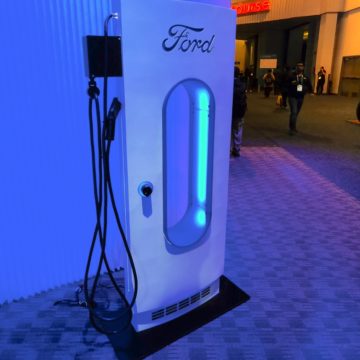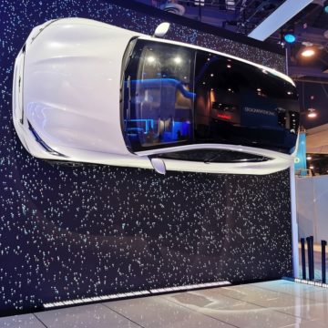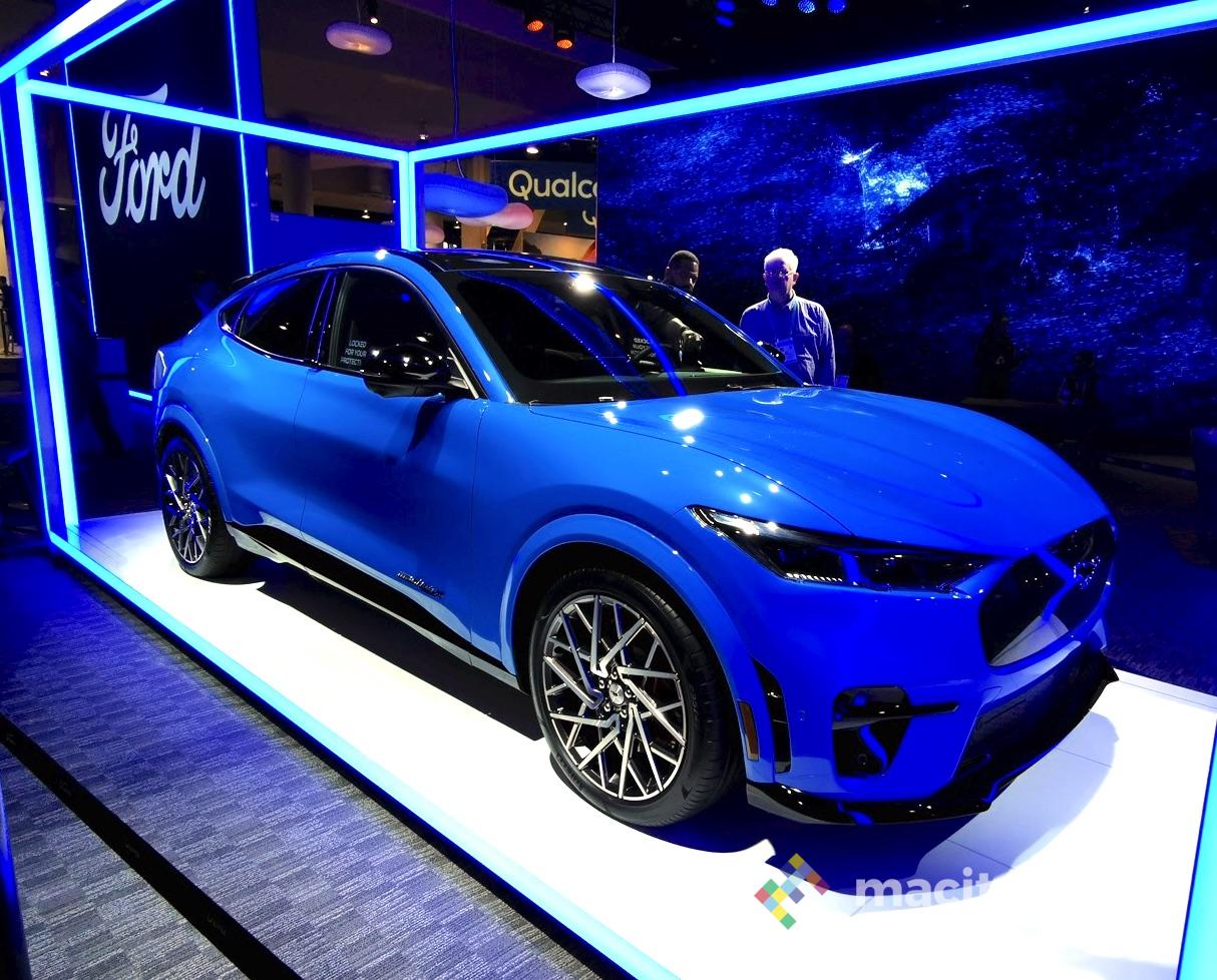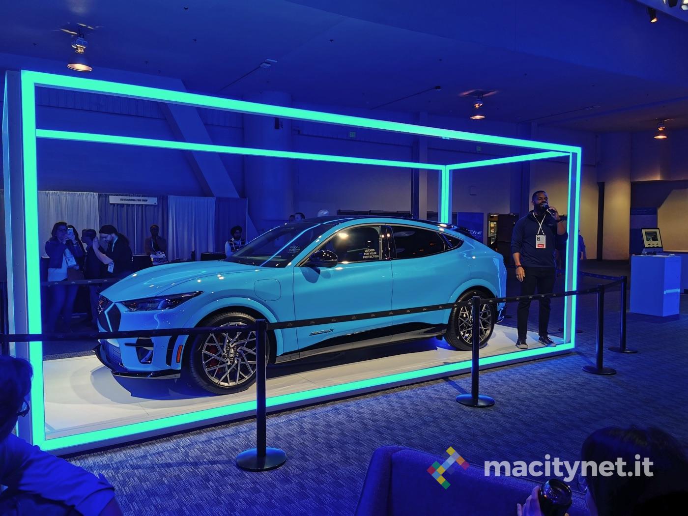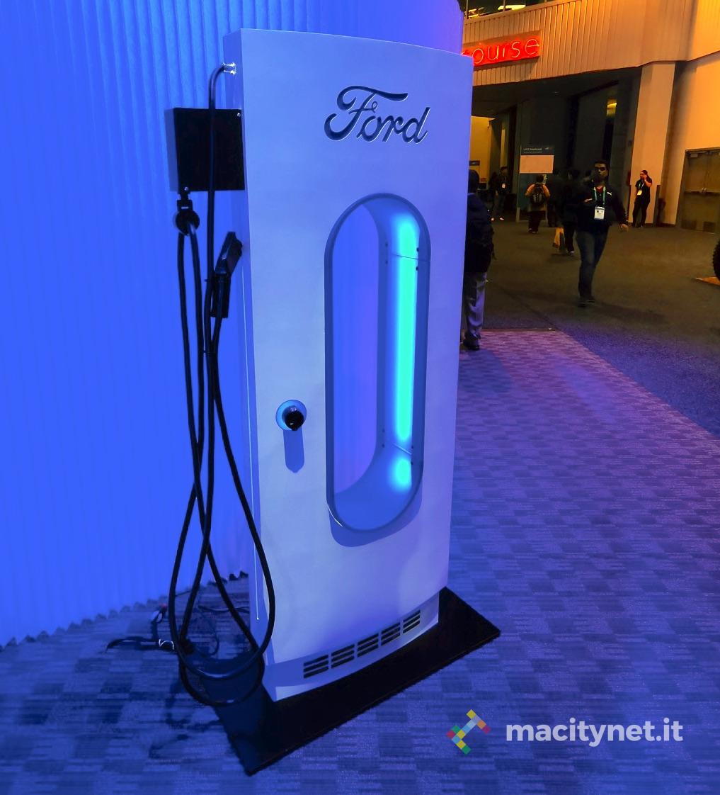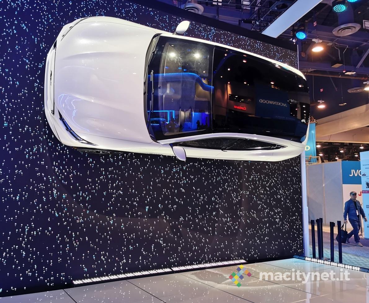 Qui sotto le immagini scattate allo stand Ford di CES 2020: notare il modello bianco “appeso” sopra le teste dei visitatori.