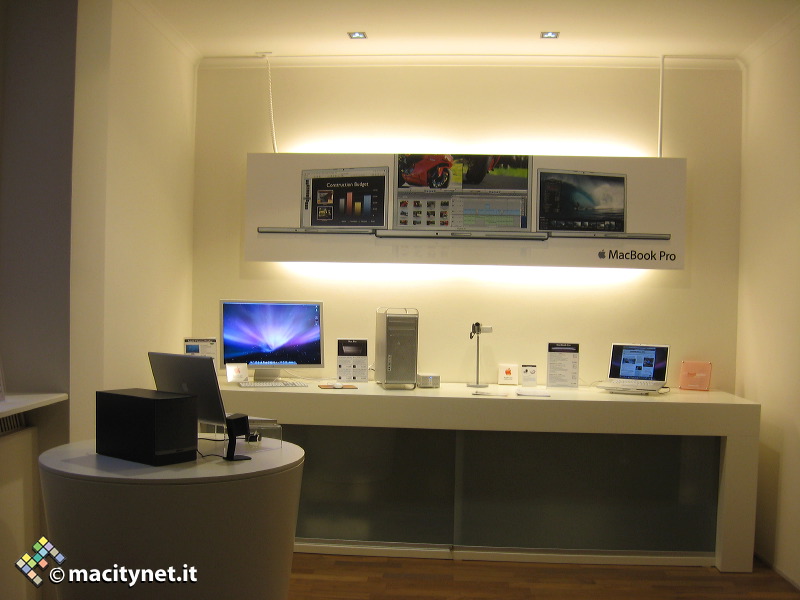 Nell’area d’ingreso abbiamo a sinistra la parte più “consumer” con iMac e iPod in prima fila
