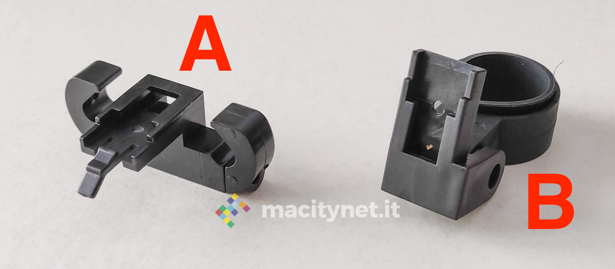Dovete quindi per prima cosa dare un’occhiata all’area inferiore della sella della bicicletta sul quale volete montare la luce: se il telaio della sella è costruito in modo tale da permettere l’aggancio del supporto (nella foto, lettera A), allora potete optare per questa soluzione, altrimenti dovrete ripiegare con l’aggancio al tubo della sella attraverso il supporto alternativo (nella foto, lettera B).