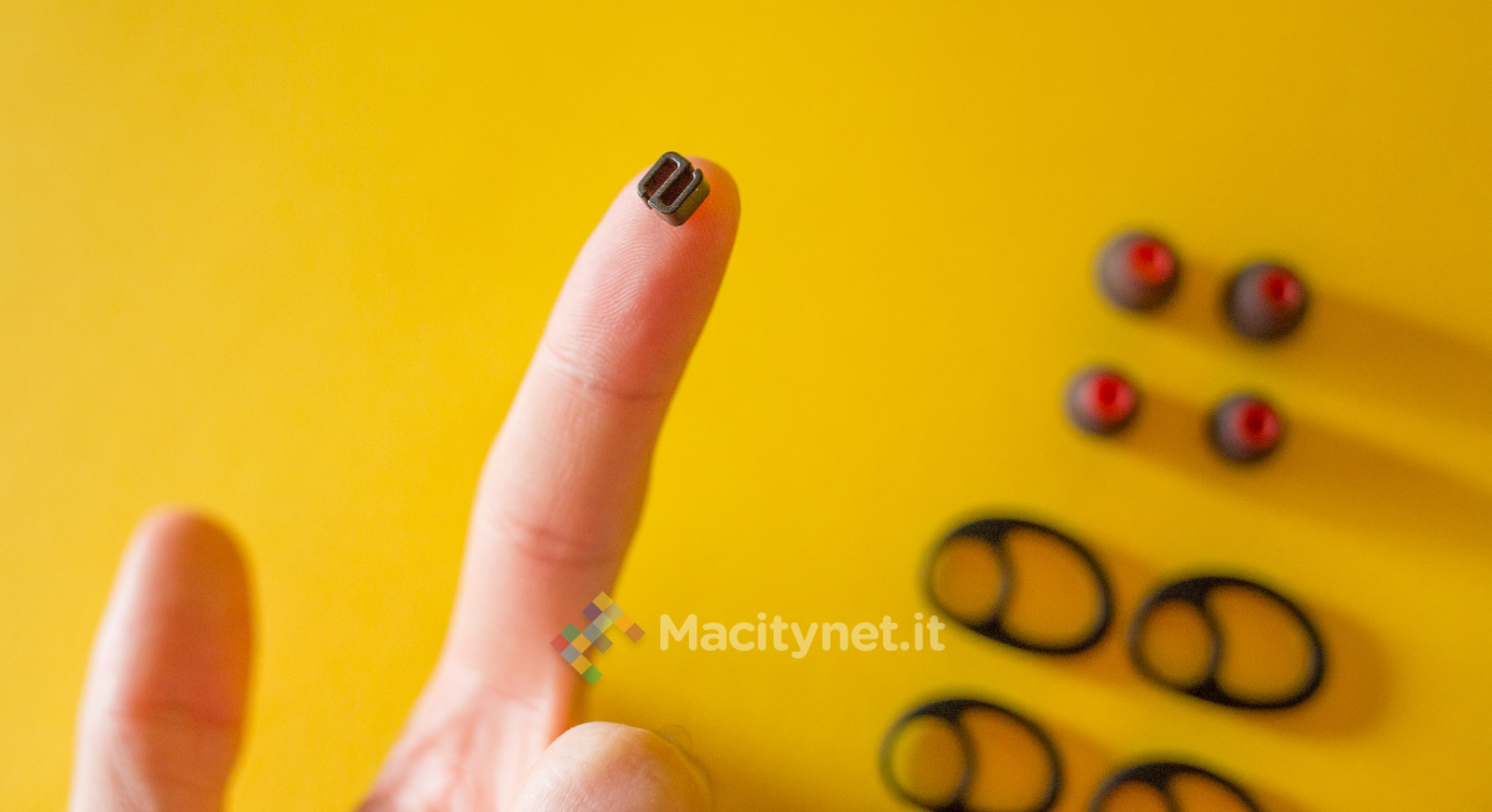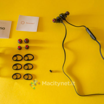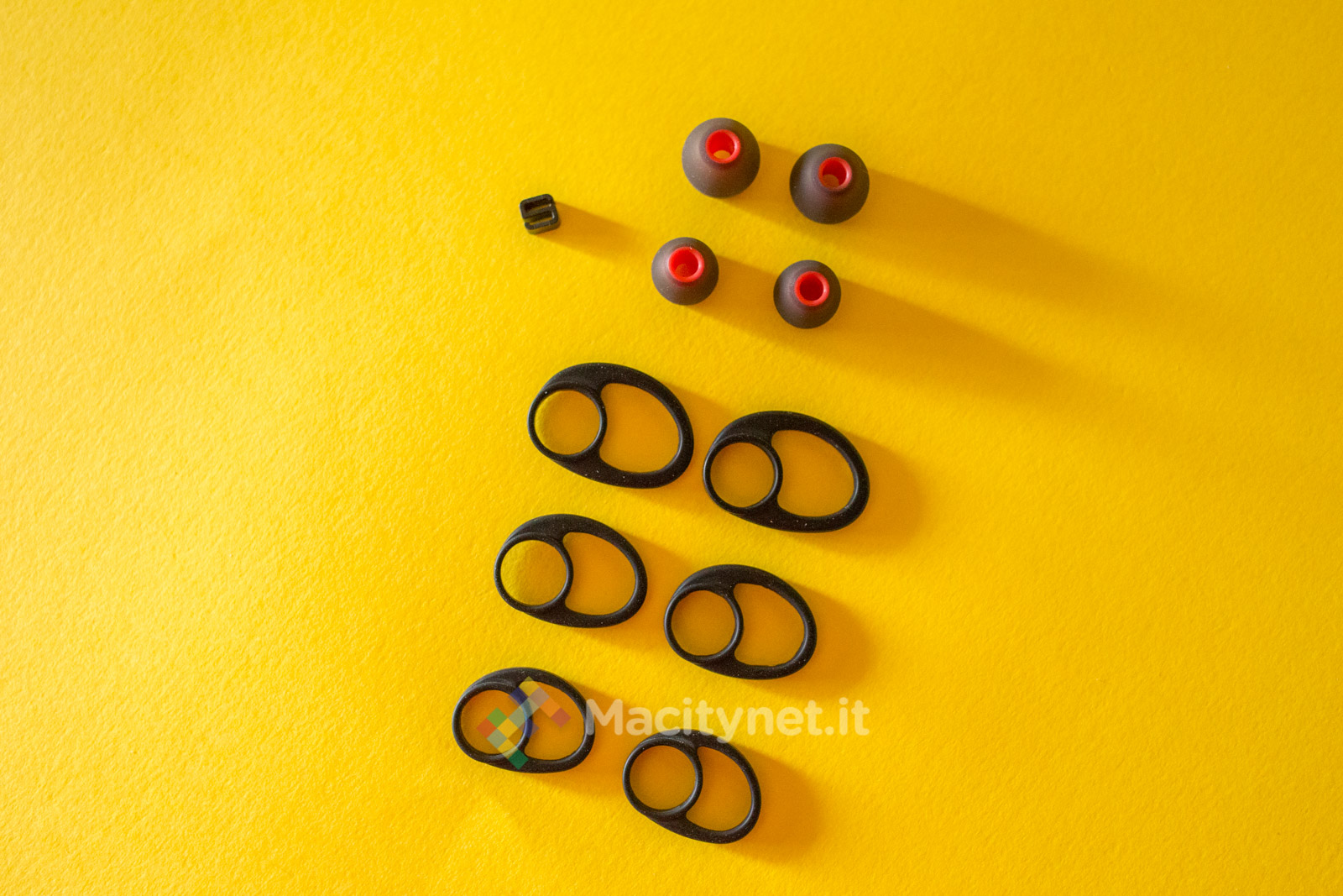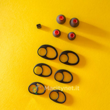 Nella confezione, seppur piccola e minimale, la società mette a disposizione una importante serie di gommini ed alette intercambiabili. Tre, le misure, per ciascun accessorio, che garantisce una migliore stabilità di ciascun auricolare ed insonorizzazione dai rumori esterni.