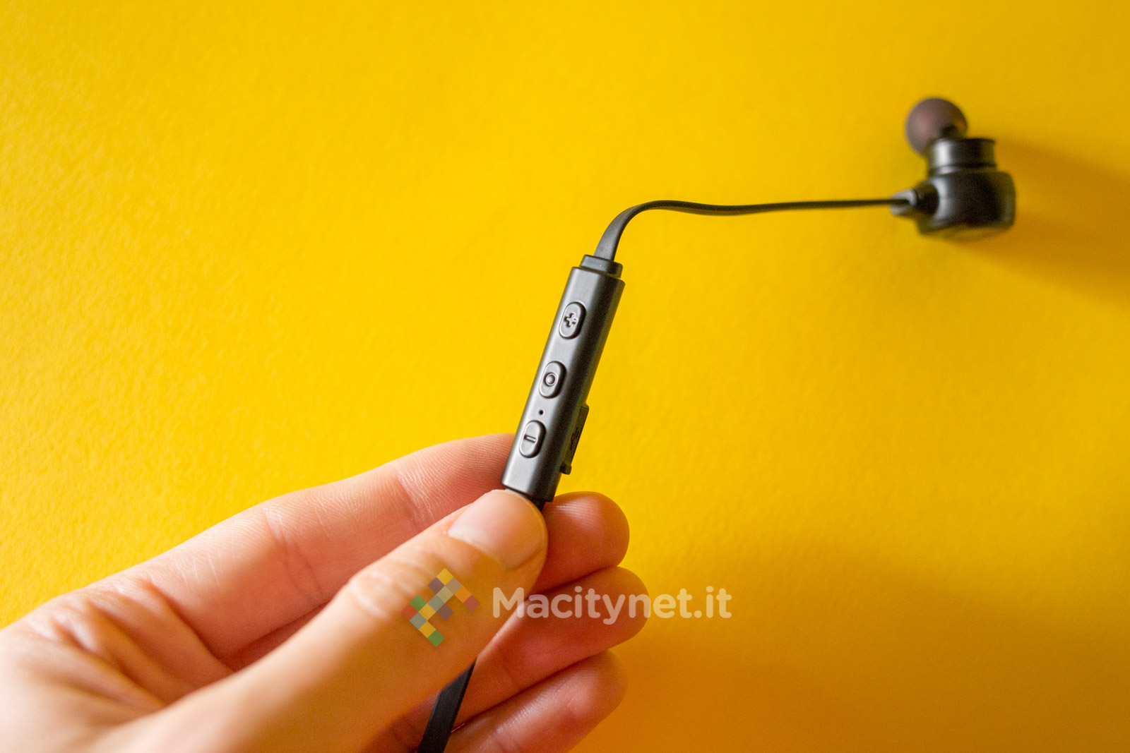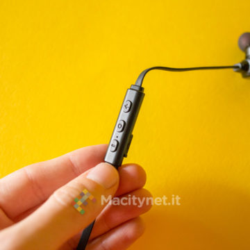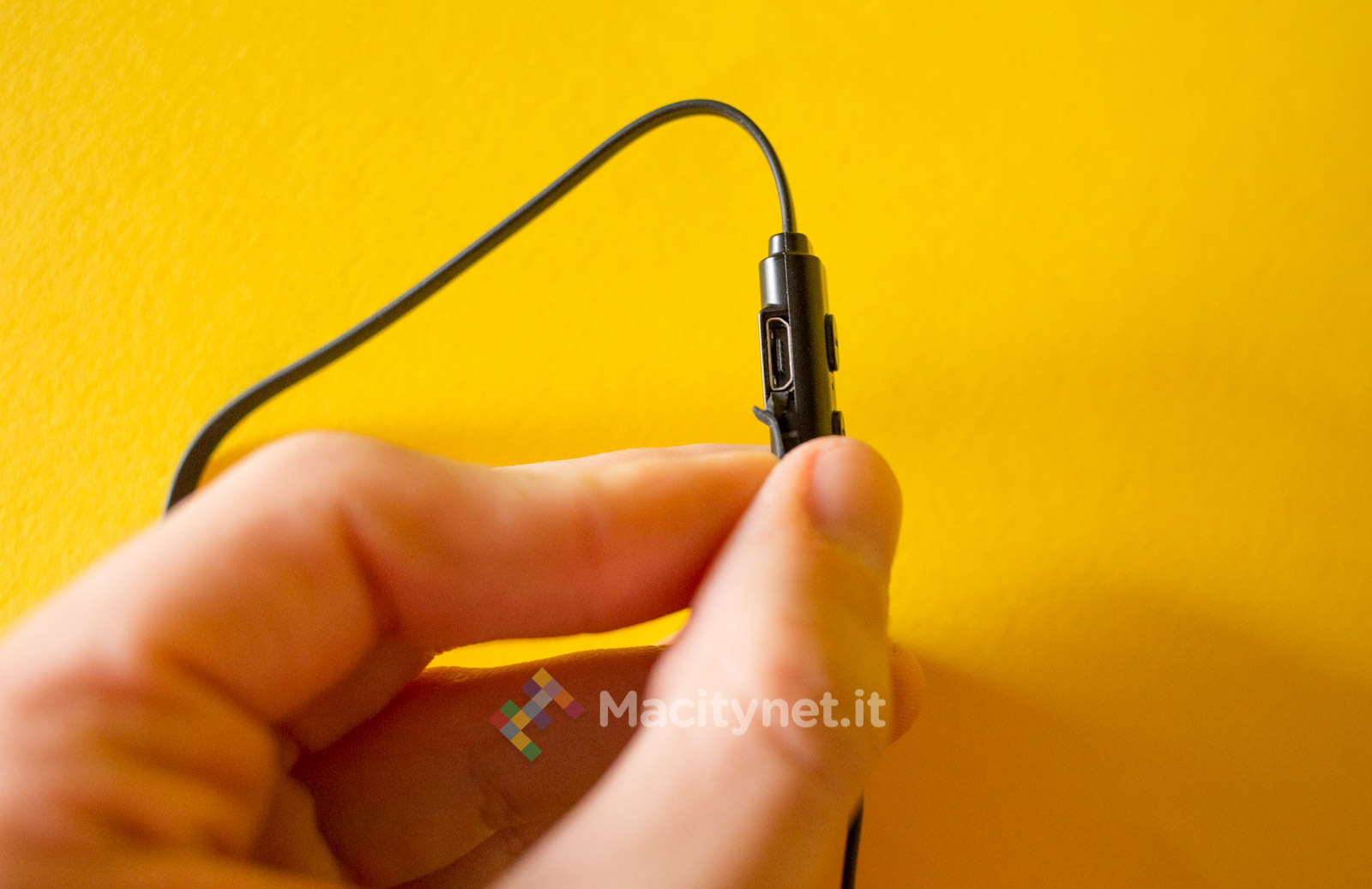 Le cuffie offrono un cavo a piattina sottile e gommato. In prossimità dell’auricolare destro è in cassato il telecomando con il bilanciere del volume, il tasto multifunzione e l’ingresso microUSB per la ricarica della batteria degli auricolari.