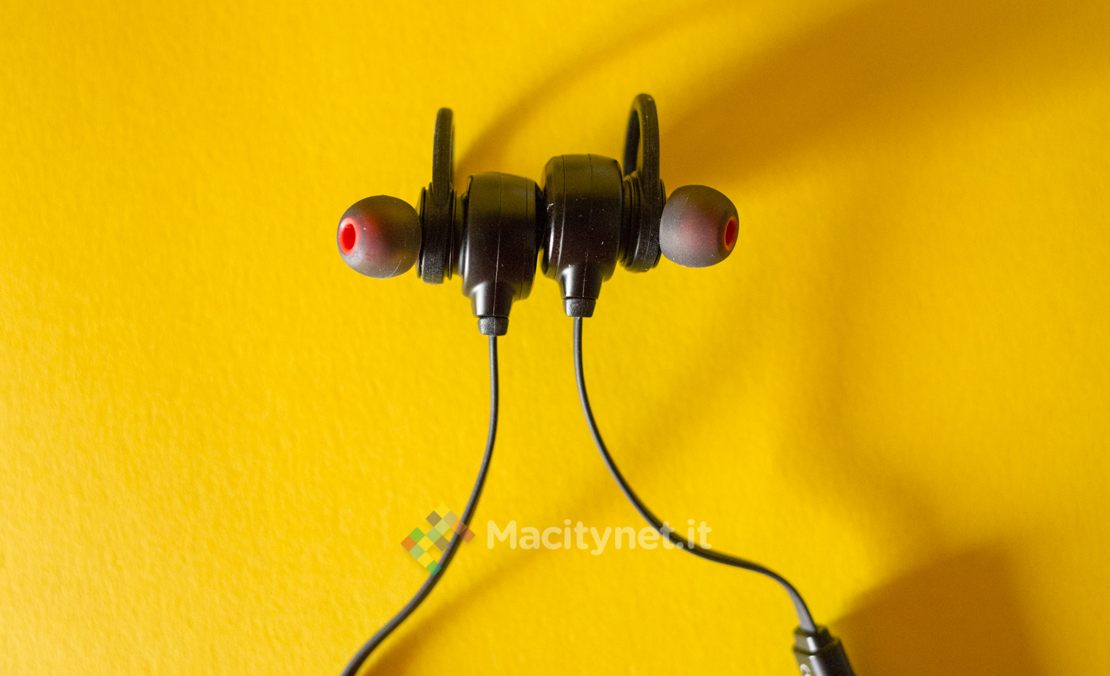 Un’altra caratteristica trascurata dal produttore nel manuale utente è la presenza di un sistema magnetico che permette di chiudere le cuffie a collana intorno al collo quando ad esempio vengono rimosse durante una pausa tra un esercizio e l’altro.