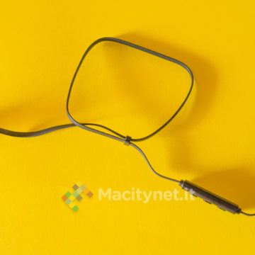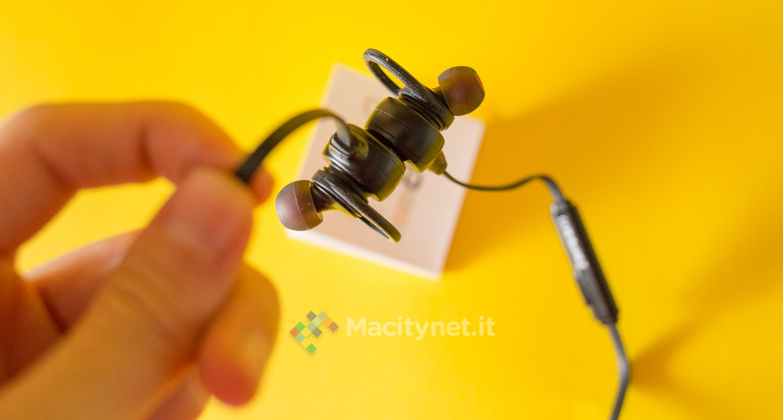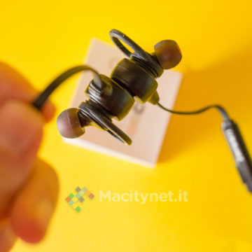In aggiunta troviamo anche una piccola clip in plastica che permette di regolare la lunghezza del cavo. Si tratta di una soluzione che in passato abbiamo trovato inclusa nel set di poche altre cuffie e che, proprio basandoci sulla nostra esperienza, abbiamo particolarmente apprezzato in quanto permette di accorciare il cavo in un attimo facendolo aderire alla nuca ed evitando che possa muoversi con i movimenti del capo che, durante gli allenamenti, sono senz’altro più accentuati.