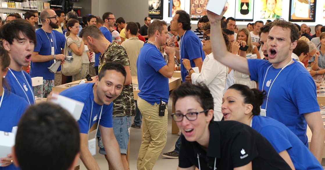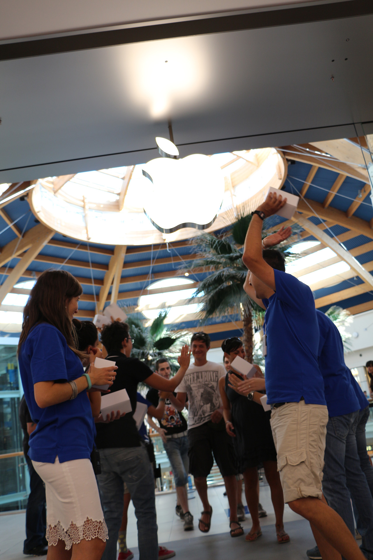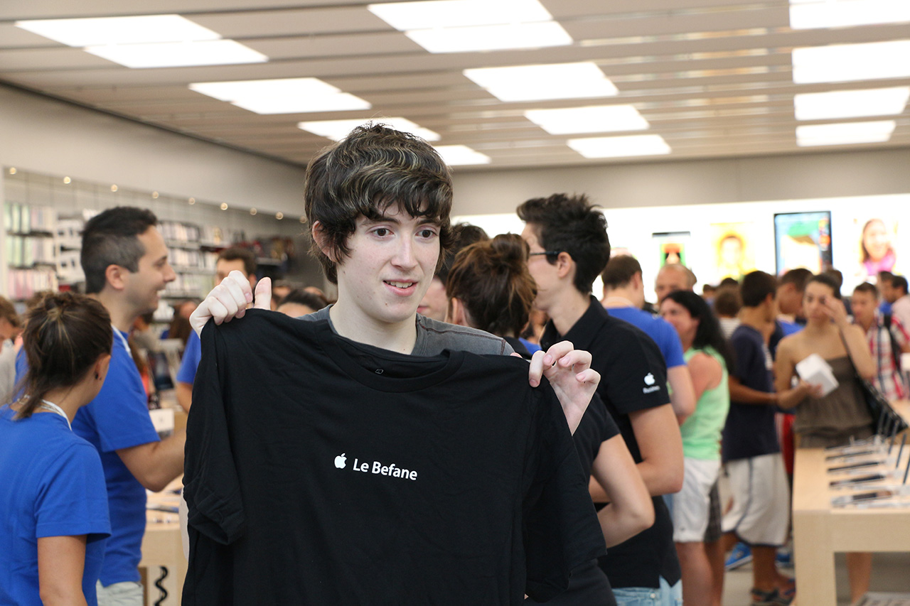 Nelle immagini qui sotto potete vedere le decine di appassionati che si sono diligentemente messi in fila per la maglietta di rito e poi sono stati gratificati dal caloroso benvenuto della numerosa squadra di accoglienza dell’Apple Store.