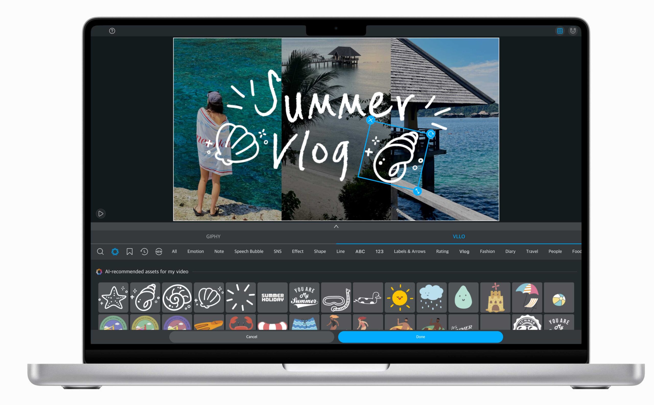 Per chi vuole realizzare il suo primo vlog o creare contenuti per i suoi canali social, l’interfaccia di VLLO rende semplice l’editing video. VLLO porta l’editing video a un nuovo livello integrando il framework Foundation Models e il framework Vision di Apple. VLLO analizza in modo intelligente l’anteprima di un video e suggerisce in automatico la musica di sottofondo perfetta e adesivi dinamici su misura per ogni scena.