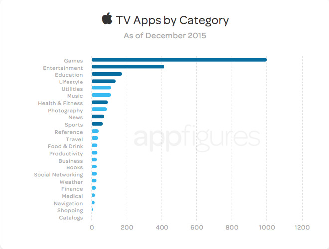 Lo studio conta attualmente su tvOS un totale di 2624 applicazioni. Proprio come iOS, la categoria più ampia è quella dei giochi, che conta circa il 38 per cento sul totale; sul podio, rispettivamente al secondo e al terzo gradino, gli applicativi intrattenimento e istruzione. Malgrado i giochi rappresentino i prodotti con il più alto tasso di crescita, però, i consumatori sembrano preferire altro: sono le app di intrattenimento ad essere le più scaricate, mentre i giochi si piazzano solo al secondo posto, seguiti dalle app Notizie, che arrivano terze nelle preferenze dei consumatori.