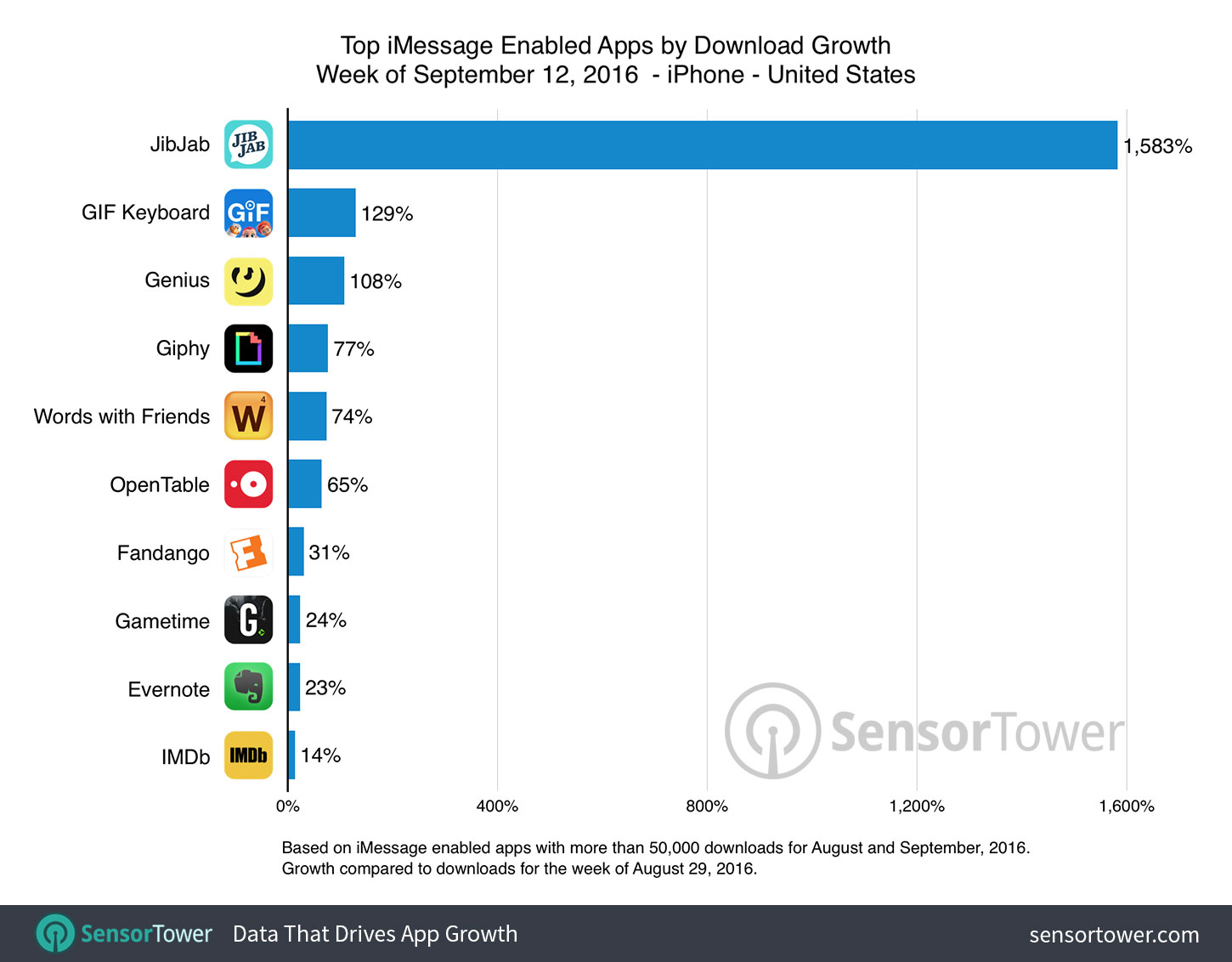 Su tutti spicca JibJab, app dedicata alla creazione di adesivi, ora saldamente in cima alla classifica evidenziata da Sensor Tower. Originariamente introdotta nel 2014, Apple ha pubblicizzato la nuova compatibilità con iMessage della applicazione relative ai messaggi su App Store durante il lancio di iOS 10, e JibJab ha subito visto una crescita di download di oltre il 1.500 per cento nella settimana del 12 settembre 2016, rispetto a due settimane prima.