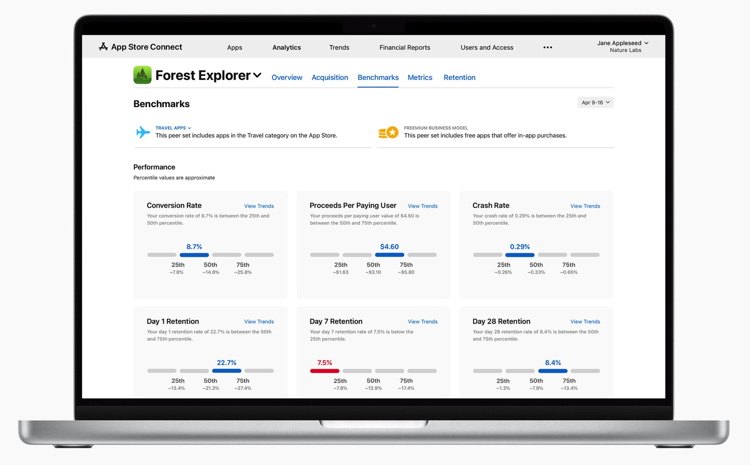 Apple ha predisposto nuove funzionalità di “benchmark” per gli sviluppatori che consentono di tenere conto di analytics sulle app nell’App Store confrontando l’andamento della propria app rispetto alla concorrenza secondo vari parametri.