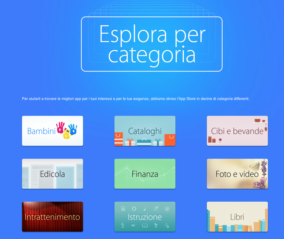 Anche in Europa Apple spinge l’utenza di App Store a ricercare maggiormente le applicazioni per categoria. A rendere noto l’intento della casa di Cupertino, anzitutto, la nuova sezione lanciata da poco in App Store e intitolata Esplora per categorie. Inoltre, da oggi, le categorie produttività, foto e video, sport, musica, utility, salute e viaggi mostreranno nelle rispettive pagine anche sottocategorie redazionali, ossia applicazioni raccomandate e consigliate personalmente dalla redazione di Apple. Queste nuove modifiche risulteranno visibili su sia App Store iOS che da Mac, mentre fino ad oggi, queste categorie ricevevano una limitata suddivisione delle app in Novità e Più Richieste, sulla base di algoritmi del tutto automatici.