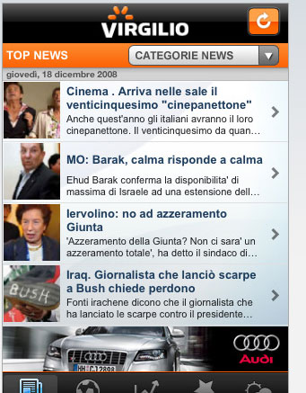 Sempre parlando di notizie un altro eccellente programma è Virgilio. L’applicazione accede al servizio di news del popolare portale italiano fornendo informazioni quali: finanza, meteo (via Gps), oroscopo, sport. Il tutto corredato d’immagini. Il controllo è semplice; opera infatti attraverso un dock alla base dello schermo principale. Virgilio promette aggiornamenti costanti. Viene distribuito gratuitamente .