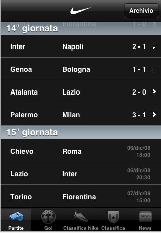 Sull’iPhone degli appassionati di calcio non deve mancare Nike Goal. Il programma, sponsorizzato dal noto produttore di articoli sportivi, è di fatto un sistema per avere sempre sottomano i risultati del campionato di calcio. L’applicazione funziona “in diretta”; in pratica ogni volta che viene segnato un gol, l’iPhone riceve la segnalazione e presenta l’aggiornamento. Nike Goal, in più, vi dice anche quale scarpa Nike ha segnato e traccia una classifica per tipo di scarpa. Nike Goal è gratuito .