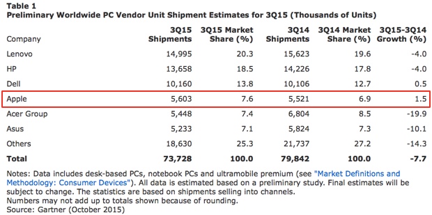 Apple 4° costruttore al mondo ma il mercato PC è cupo e cala del 7,7%