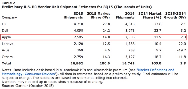 Negli USA il business di Cupertino va ancora meglio: le vendite di Mac aumentano del 7,3% permettendo così ad Apple di passare dal 13,9% di mercato al 14,8%. Negli USA Apple è il terzo costruttore più importante alle spalle di HP che rimane prima e Dell seconda in classifica. Secondo gli analisti di Gartner a livello globale le vendite di computer sono calate del 7,7% nei dati preliminari del terzo trimestre, andamento definito “cupo” per lo più dovuto al dollaro forte sulle altre monete che fa lievitare i prezzi di circa il 10%. A questo si aggiunge un moderato o quasi nulla effetto di Windows 10: nella fase di lancio infatti il nuovo sistema operativo di Microsoft è stato installato su macchine esistenti, piuttosto che acquistando nuovi sistemi. Questo potrebbe cambiare nei prossimi mesi con il lancio di nuovi computer, soprattutto portatili, convertibili e ultraleggeri, e con la propensione all’acquisto prevista in miglioramento per il periodo delle festività e dei mesi successivi.