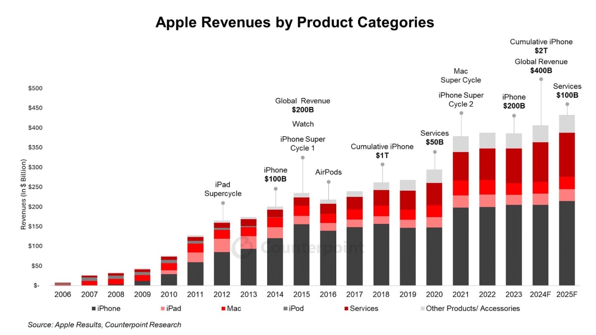 Si prevede che il fatturato annuale di Apple per il 2024 sarà di circa 400 miliardi di dollari. A evidenziarlo sono proiezioni di Counterpoint Research, secondo la quale i numeri record saranno trainati sia dalla crescita dell’hardware, sia dai servizi.
