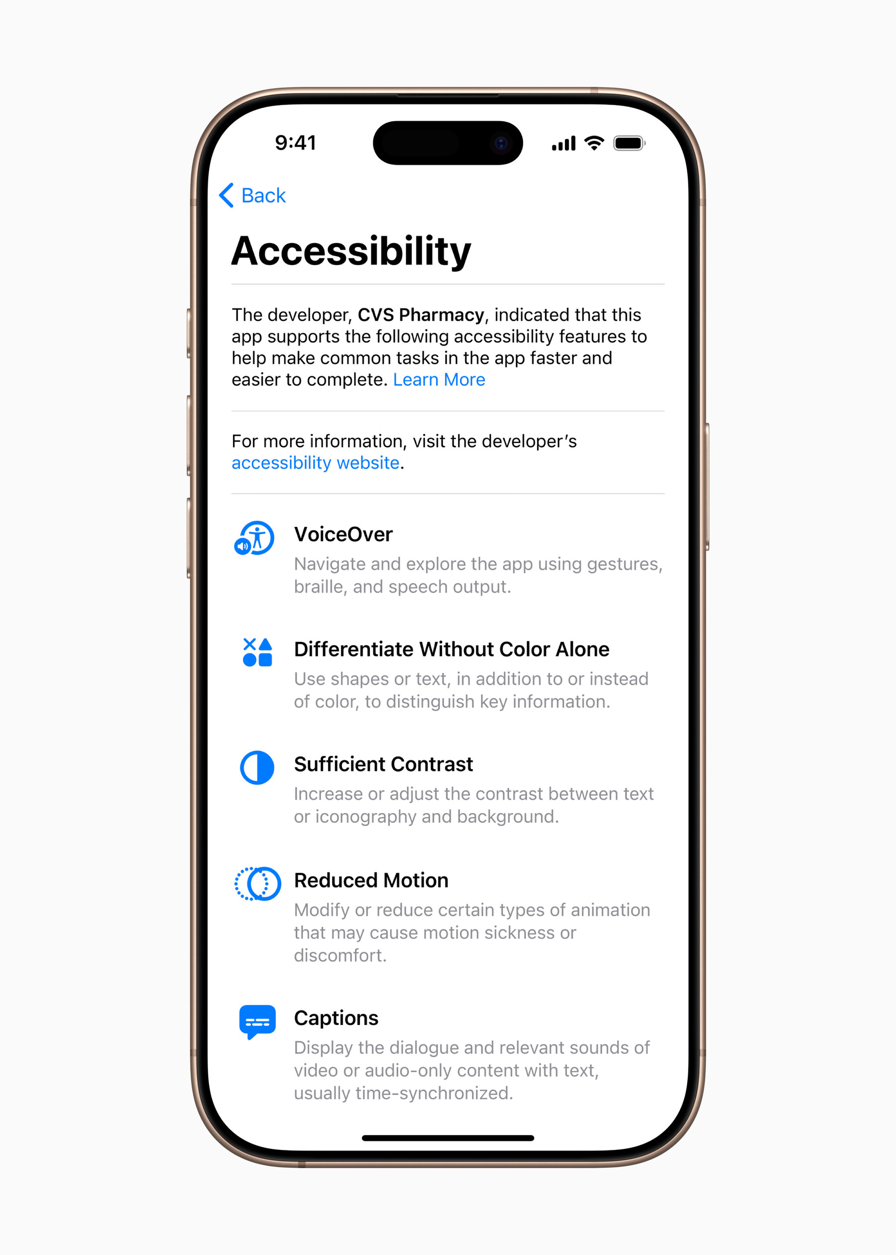 Partiamo dalle Accessibility Nutrition Labels, una nuova sezione che sarà visibile nelle pagine delle app sull’App Store. Consentiranno di vedere con chiarezza quali funzioni di accessibilità offre una determinata app: VoiceOver, Controllo Vocale, Testo grande, Contrasto, Riduzione movimento, sottotitoli e altre ancora. Un aiuto concreto per chi ha esigenze specifiche e vuole evitare sorprese dopo il download.