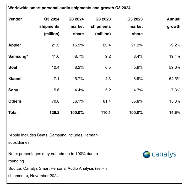 Nel terzo trimestre del 2024 Canalys segnala “un rimbalzo consistente” nel mercato “smart personal audio”, con la spedizione globale di 126 milioni di unità, con una crescita anno su anno del 15%: anche se in calo Apple continua a dominare il mercato degli accessori audio con la gamma AirPods e la controllata Beats.