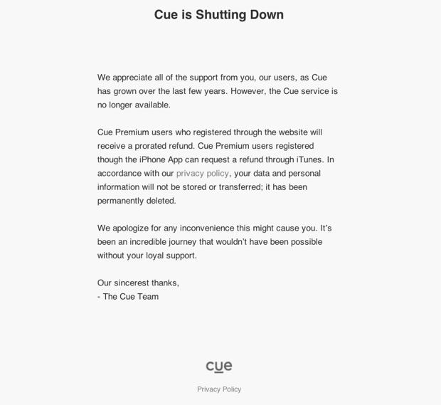 Con il nome Cue e l’app omonima, ora rimossa da Apple Store, il software è in grado di trasformare automaticamente dati, file ed email, come per esempio prenotazioni per voli, ristoranti e altri impegni in appuntamenti in agenda. Cue ha comunicato lo stop al servizio ai propri utenti nel corso della giornata di martedì, annunciando anche un rimborso per gli utenti che hanno sottoscritto un abbonamento al servizio premium. Le tecnologie di Cue potrebbero essere impiegate da Apple per potenziare e migliorare il funzionamento di Siri e delle notifiche soprattutto in iOS 7.