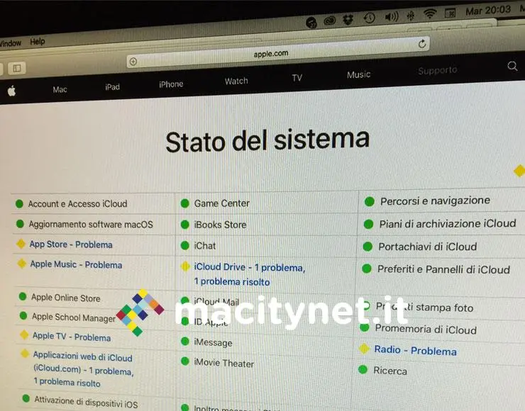Apple ha aggiornato la grafica della pagina web System Status, quella che in pratica consente di conoscere lo “Stato del sistema” dei vari servizi della Mela (il funzionamento di FaceTime, iMessage, Apple Music, Portachiavi iCloud, ecc.).