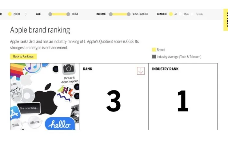 Sul sito di MBLM è possibile giocare con i filtri per vedere in che modo l’età e il reddito incidono sul punteggio del legame degli utenti con il marchio. Se si considerano i consumatori di età compresa tra 18 e 24 anni, ad esempio, la forza del legame con Apple scende al settimo posto assoluto, mentre per gli utenti tra i 35 e i 65 anni Cupertino sale al primo posto in assoluto.