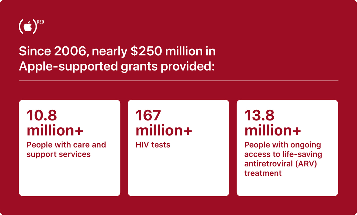 «Nel 2006, Apple si è unita alla missione di (RED) per porre fine all’epidemia di HIV / AIDS nell’Africa subsahariana. Negli ultimi 14 anni, la partnership di Apple con (RED) ha portato a quasi 250 milioni di dollari in donazioni per i programmi HIV / AIDS del Fondo globale che offrono servizi di prevenzione, test e consulenza. Dal 2006, i sussidi sostenuti da Apple hanno fornito a oltre 10,8 milioni di persone servizi di assistenza e supporto, hanno contribuito alla distribuzione di oltre 167 milioni di test HIV e hanno fornito a 13,8 milioni di persone l’accesso continuo a cure antiretrovirali salvavita (ARV).
