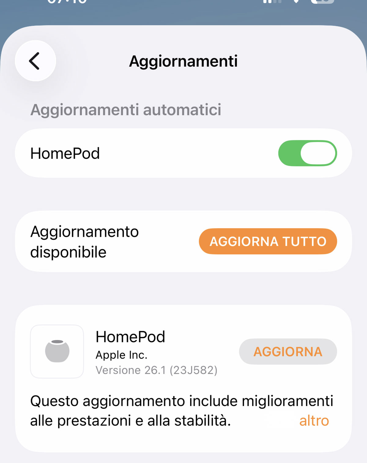 Aggiornamento software indicherà anche se l’HomePod è già aggiornato e mostrerà il software di HomePod installato.