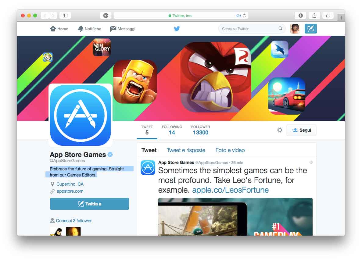 Le icone nell’immagine d’intestazione del profilo citano grandi nomi di successo (Clash of Clans, Candy Crush Soda Saga, Angry Birds 2, Fallout Shelter…); la sezione bio recita: “Embrace the future of gaming. Straight from our Games Editors” (abbracciamo il futuro del gaming, direttamente dai nostri curatori della sezione giochi).