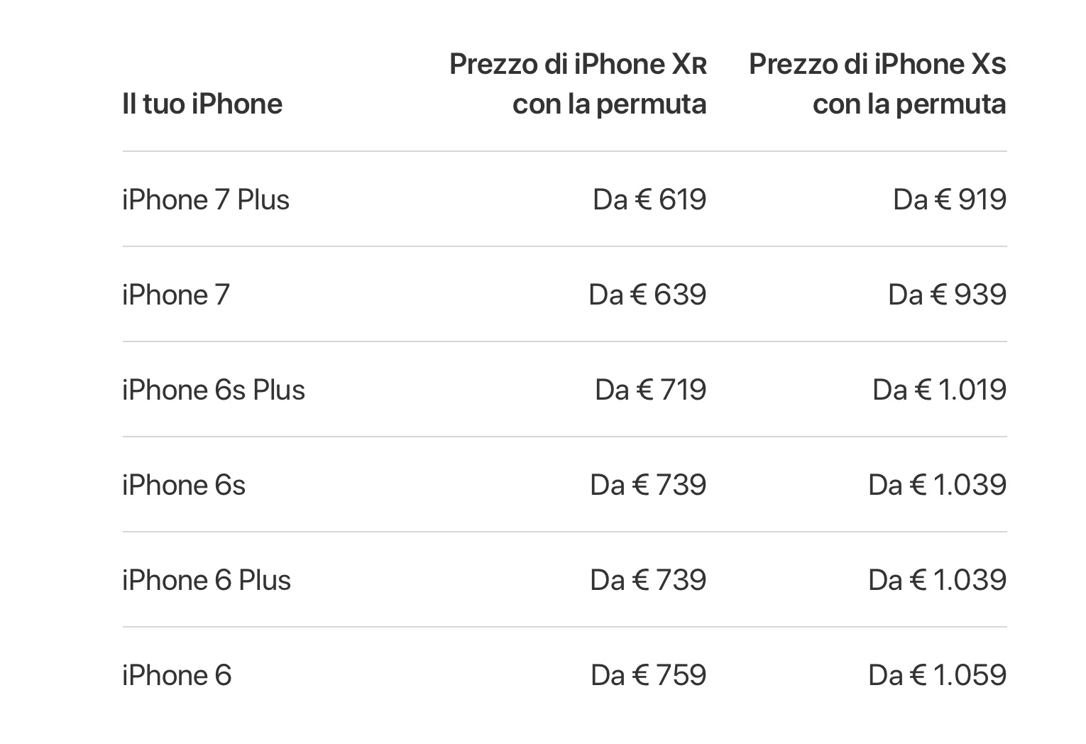 Anche in Italia Apple lancia una offerta per acquistare a prezzo scontato iPhone XS e iPhone XR a chi porta in permuta in un Apple Store un vecchio iPhone. L’operazione, nata negli USA e poi introdotta in Cina ed Australia, è di fatto una estensione con più convenienza della precedente politica di permuta. Grazie alla maggior generosità di Apple è ora possibile (portando un iPhone 7 Plus da 32 GB) comprare un iPhone XR a partire da 619 euro e un iPhone Xs da 919 euro.