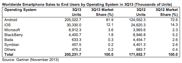 Apple, al contrario, è cresciuta in termini reali di vendite, piazzando sul mercato nel periodo di riferimento ben 30 milioni di smartphone, ossia il 6 per cento in più rispetto al 2012. Se il dato di vendite di smartphone è confortante per Apple, i dati raccolti da Gartner evidenziano, però, un calo nella quota di mercato detenuta da iOS, che rispetto al medesimo dato temporale del 2012, cala dal 14,3% al 12,1%. In realtà, però, questi dati sono parzialmente fuorvianti, perché il periodo temporale preso in esame, precede l’arrivo sul mercato di iPhone 5s e di iPhone 5c. Le vendite dei nuovi modelli, soprattutto di iPhone 5s, sono risultate molto elevate nel primo weekend di lacio e la disponibilità continua a essere inferiore rispetto alla domanda: il picco di vendite influenzerà i risultati del prossimo trimestre. Aggiungiamo a questo, che il periodo delle vacanze natalizie, solitamente molto favorevole per Apple, potrebbe in gran parte stravolgere queste statistiche. Insomma, occorre aspettare l’ultimo trimestre prima di poter tirare le somme.