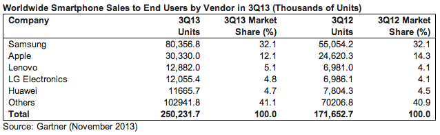 Nonostente l’aumento delle vendite di iPhone Apple registra un calo nella propria percentuale di mercato. E’ questo quanto emerge dagli ultimi dati di Gartner per il mercato smartphone e cellulari nel terzo trimestre del 2013. Il mercato degli smartphone è in continua espansione e nel complesso sono stati 455,6 milioni i telefoni cellulari venduti nel terzo trimestre del 2013, in crescita del 5,7%.