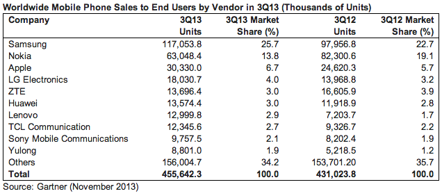 La stessa fonte ha pubblicato i dati generali di vendita, riferiti al terzo trimestre di questo 2013, dai quali è possibile ricavare molteplici considerazioni. Anzitutto, il colosso Samsung continua indisturbato nel detenere la leadership globale all’interno del mercato mobile, con una quota di mercato che sfiora il 26%, ossia 3 punti percentuali in più rispetto all’anno scorso. Al secondo posto Nokia, nonostante il declino che ha letteralmente investito l’azienda negli ultimi anni, anche se ancora in calo e sempre più incalzata dalla casa di Cupertino.
