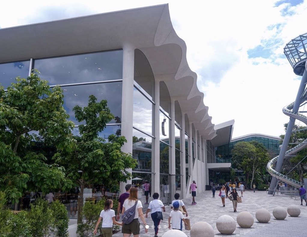 Non manca anche in questo Apple Store l’attenzione al verde: nel negozio, infatti, sono stati installati alberi tropicali tipici del territorio, alti 22 piedi, in continuità con il verde pubblico che si trova fuori dallo Store, dove sono stati posti tavoli e sedie in teak che riprendono, invece, il layout interno.