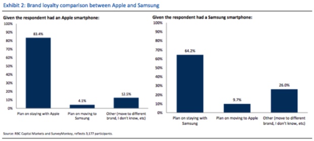 Infine Apple batte Samsung anche per quanto riguarda le intenzioni di acquisto: solo il 4% di chi possiede iPhone ha dichiarato di voler passare a un terminale Samsung con il prossimo acquisto, percentuale che sale fino al 10% nel caso di chi possiede uno smartphone Samsung.