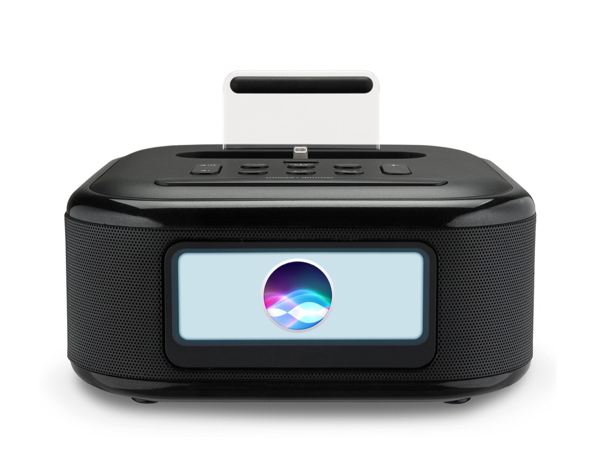 Il dock che appare nella documentazione è un dispositivo «Smart che comunica con un dispositivo elettronico portatile e capace di attivare una modalità di riconoscimento vocale» e nell’immagine è rappresentato da una sorta di base di ricarica tecnologica con schermo, altoparlanti e microfono, insieme ad un processore abilitato per il riconoscimento della voce.
