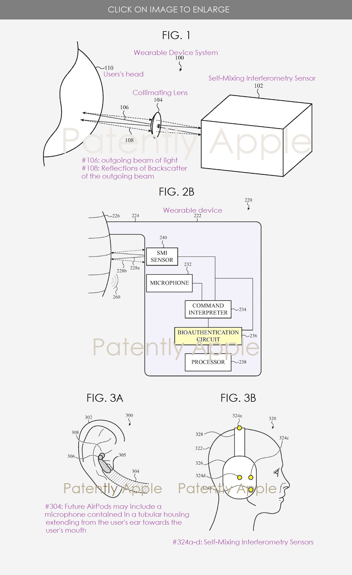 Dal Patent & Trademark Office statunitense si apprende l’esistenza di un brevetto di Apple che descrive sistemi di bioautenticazione destinati a futuri accessori come AirPods, cuffie over-ear ma anche visori AR/VR. Nel brevetto, scovato dal sito PatentlyApple, si fa riferimento a configurazioni e metodi che sfruttano la correlazione incrociata di segnali dell’interferometria per riconoscere gli input dell’utente.