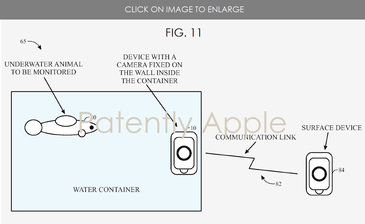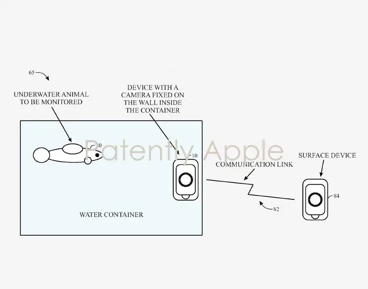 La Casa di Cupertino spiega che il dispositivo usato può essere impermeabile o racchiuso una custodia/involucro impermeabile. Apple ha previsto la possibilità sfruttare il dispositivo semplificano l’uso sott’acqua integrando funzionalità come ad esempio tastiere visualizzate con caratteri più grandi e inviare al volo messaggi di segnalazione o emergenza (“Aiuto!”, “Squalo!”, “Torno su”, “Vado giù”, ecc.). È possibile inviare in tempo reale immagini o filmati, disattivare alcune funzionalità quando la batteria non è completamente carica e ricaricare il dispositivo a induzione anche quando questo è ancora sigillato nella custodia waterproof. Tra i vari scenari previsti da Apple, anche la possibilità di sfruttare la ricarica in mare grazie ad un’antenna collocata su una nave o altra imbarcazione.