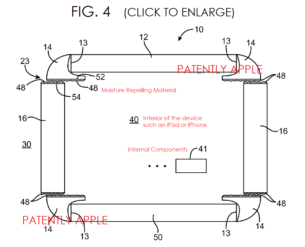 Presso il Patent and Trademark Office statunitense sono stati individuati nuovi brevetti registrati da Apple. Alcuni di questi riguardano sistemi l’impermeabilità dai fluidi e potrebbe avere a che fare con dispositivi iOS (il nuovo iPhone 6?). In uno dei brevetti si cita il controllo dell’intrusione dell’umidità all’interno di dispositivi elettronici e un rivestimento repellente (idrofobo e oleofobico) per la struttura che diminuisce la probabilità che gocce di acqua o altri elementi finiscano all’interno.