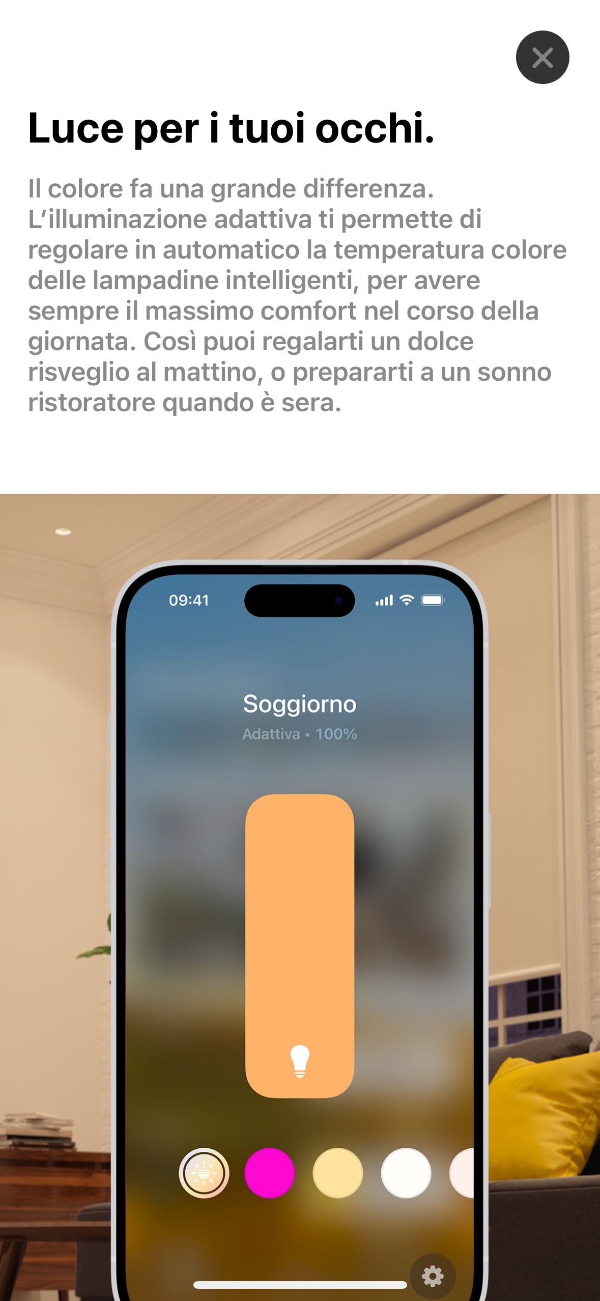 L’illuminazione adattiva o Adaptive Lightning è supportata fin dal 2020 con iOS 14 ma solo per dispositivi certificati HomeKit: con il rilascio di iOS 18 a settembre l’app Apple Casa supporterà Adaptive Lightning per un numero molto più ampio di lampadine e dispositivi tramite lo standard universale Matter per la smart home.