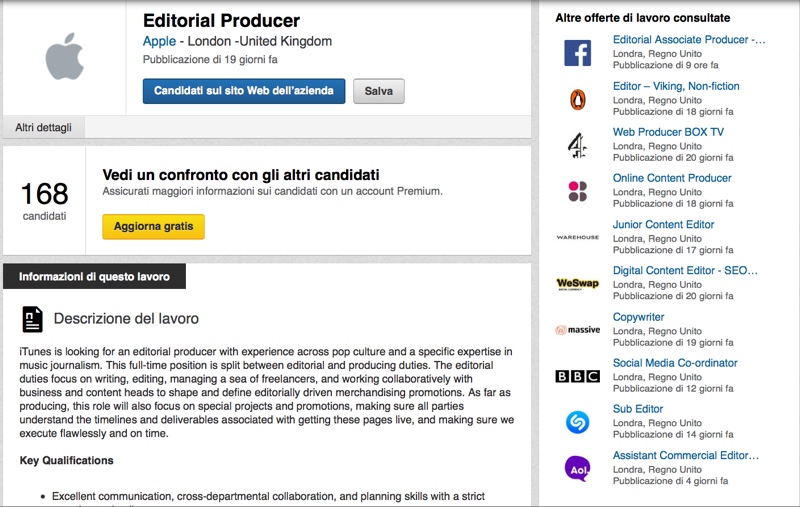 Apple cerca un giornalista esperto di musica che sarà inserito nel team iTunes con sede a Londra. L’annuncio di ricerca personale è stato pubblicato oltre due settimane fa, anche tramite LinkedIn, ma è stato rilevato solo in queste ore da Musically. Nel momento in cui scriviamo per la posizione Editorial Producer di Apple hanno già sottoposto la propria candidatura 168 persone, un numero elevato considerando che si tratta di una figura specializzata, non molto però se si tiene in considerazione il periodo non facile per le pubblicazioni cartacee e soprattutto l’elevata attrattiva di poter lavorare con una multinazionale non solo in forte crescita ma senza dubbio tra le più ammirate al mondo.