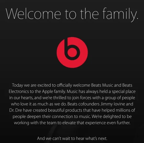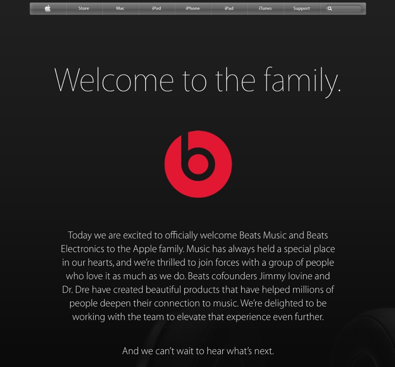 Dalla home page del sito Apple è possibile raggiungere con un clic la pagina di benvenuto pubblicata oggi dedicata a Beats. Nel messaggio di Cupertino troviamo il benvenuto per il team Beats all’interno di Apple, inclusi Dr. Dre e Jimmy Iovine, le due menti e co-fondatori del celebre marchio di accessorio audio: “Oggi siamo entusiasti di accogliere ufficialmente Beats Music e Beats Electronics nella famiglia Apple. La musica ha sempre avuto un posto speciale nei nostri cuori, e siamo entusiasti di unire le forze con un gruppo di persone che l’amano tanto quanto noi. I co-fondatori di Beats Jimmy Iovine e Dr. Dre hanno creato prodotti bellissimi che hanno aiutato milioni di persone ad approfondire la loro connessione alla musica. Siamo lieti di lavorare con il team per elevare l’esperienza ancora di più. E non vediamo l’ora di ascoltare le novità”.