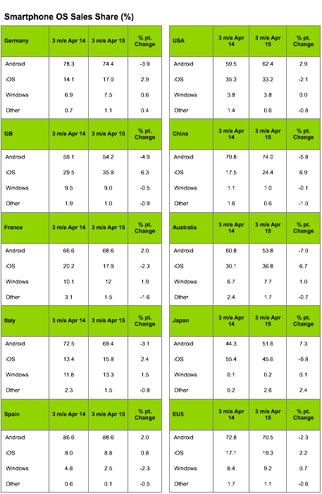 Il fenomeno è però piuttosto generalizzato e non riguarda solo l’Italia o l’Europa. In Cina, Android scende di quasi il 6% (e iOS aumenta di quasi il 7%, in Australia succede più o meno la stessa cosa). Solo in Giappone e, stranamente, USA si assiste allo stesso fenomeno, ma qui Apple è a percentuali di vendite mostruose: 33,2% negli USA e 45,6% in Giappone.