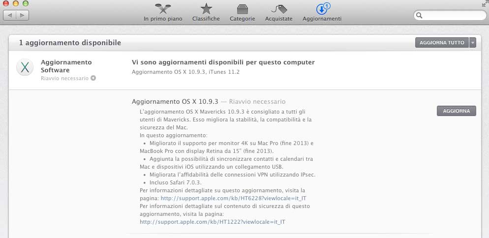 È stato finalmente rilasciato l’update che porta OS X 10.9 Mavericks alla versione 10.9.3. L’update, fa sapere Apple, è consigliato a tutti gli utenti, migliora la stabilità, la compatibilità e la sicurezza del Mac. Nelle note di rilascio si spiega che l’aggiornamento migliora il supporto ai monitor 4K sui Mac Pro fine 2013 e MacBook Pro con display Retina da 15″ fine 2013, è stata aggiunta la possibilità di sincronizzare contatti e calendari da Mac e dispositivi iOS utilizzando un collegamento USB, migliorata l’affidabilità delle connessioni VPN utilizzando IPSec, integra Safari 7.0.3, risolve un problema che impediva da Libro font l’installazione di font PostScript Type 1, migliora l’affidabilità di copia, editing e gestione permessi sui file server SMB, migliora l’affidabilità nelle home directory dei network, migliora la stabilità dei profili di configurazione, migliora la velocità di login per gli utenti dei gruppi Active Directory.
