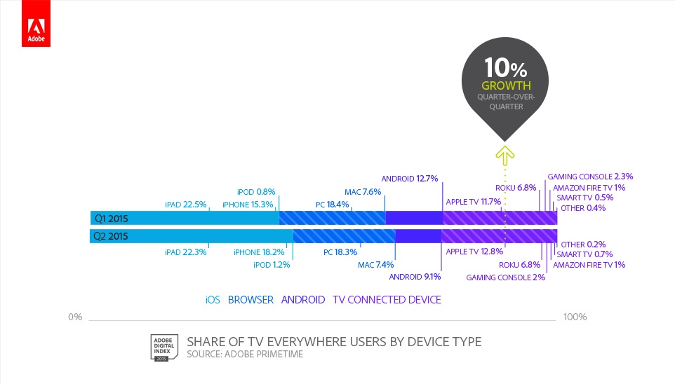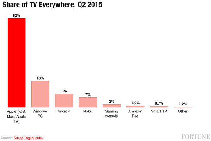 In questo settore Apple domina il mercato con il 62% del market share, almeno secondo dati elaborati da Adobe su 159 miliardi di video online. “La TV Everywhere è un colosso” dice Tamara Gaffney di Adobe, “sta arrivando indipendentemente se il mercato è pronto o no”. È il business, spiega ancora Forbes, nel quale Apple potrebbe fare il suo trionfale ingresso con annunci specifici giorno 9 settembre. Apple domina nel settore non solo per la Apple TV ma perché questo non è il solo dispositivo della Mela sfruttato per usufruire di video autenticati. Dalle analisi Adobe si ricava come gli utenti della TV Everywhere sfruttino iPad, iPhone, Mac, Apple TV e iPod touch.