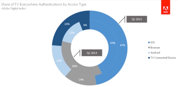 video digitale apple giugno 2015 adobeInteressanti le conclusioni formulate dagli analisti Adobe: “Ci aspettiamo che Apple capitalizzerà sul grande vantaggio che possiede in questa area della fruizione video premium autenticati” dichiara Tamara Gaffney, principal analyst Adobe Digital Index riportata da TNW “Questo perché possiedono iPad e iPhone che hanno sempre avuto, e [perchè, ndr] sono cresciuti in termini di numero di persone che accedono ai contenuti in questo modo”. Il consumo di contenuti, TV e video via Internet è cresciuto del 282% anno su anno, mentre cala quello effettuato tramite computer desktop.