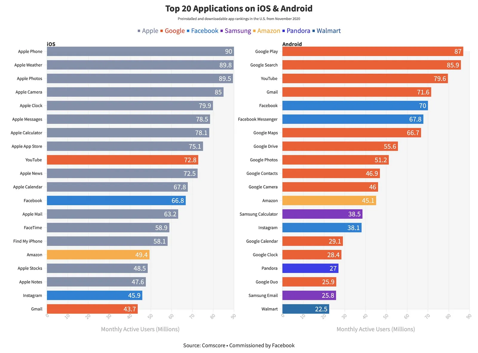 Facebook alza la posta, anche se per interposta persona, contro Apple e Google tramite uno studio commissionato dal colosso dei social e realizzato da Comscore, che dimostra come le app preinstallate di Apple e Google limitino la concorrenza.