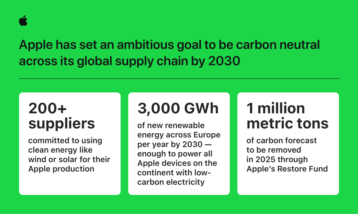 Il colosso di Cupertino offre inoltre una suite di risorse di apprendimento online e formazione dal vivo, poiché “lavora a stretto contatto con i suoi fornitori e partner locali per identificare soluzioni efficaci per l’energia rinnovabile e la rimozione del carbonio». Oltre 200 fornitori che rappresentano oltre il 70% della spesa di produzione diretta di Apple si sono già impegnati a utilizzare energia pulita come eolica o solare per tutta la produzione Apple, tra cui Corning, Nitto Denko Corporation, SK hynix, STMicroelectronics, TSMC e Yuto.