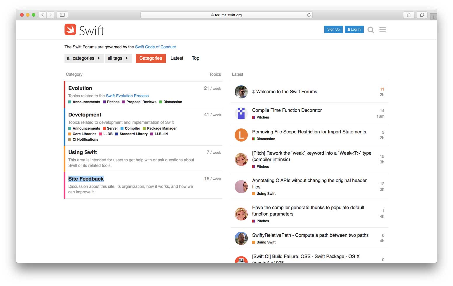 Il sito web con il forum Swift dedicato si compone di quattro sezioni: Evolution con argomenti concernenti l’evoluzione di Swift, Development per discussioni legate allo sviluppo e all’implementazione di Swift, Using Swift quindi un’area per aiutare gli utenti alle prese con problemi o che hanno bisogno di fare domande su Swift e relativi strumenti, infine Site Feedback per le discussioni relative al sito, all’organizzazione e così via.